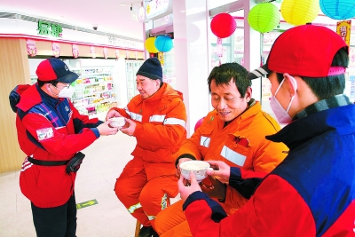 北京石油在爱心驿站、司机之家开展“喜迎元宵节,爱心送汤圆”活动,邀请环卫工人、货车司机等一起品元宵、过佳节,为他们送上暖心祝福。图为2月2日实润加油站员工为环卫工人送上元宵。本报记者 苟澜弋 摄 于 慧 王晓璇 文