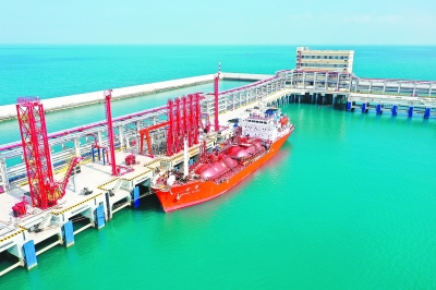▲1月30日,载有570吨丁烯-1的“宏康”船在海南炼化乙烯码头顺利靠泊接卸。该码头是海南炼化100万吨/年乙烯项目配套码头工程,这是码头投用以来接卸的第一船物料。图为1月31日“宏康”船在码头接卸丁烯-1物料。 吴淑汕 摄 刘海龙 文