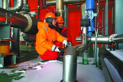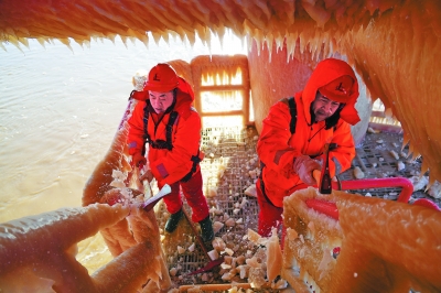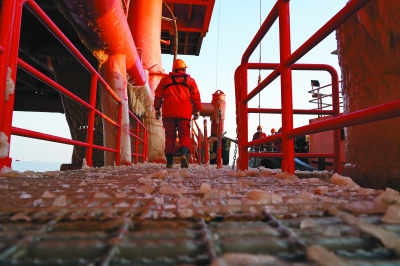 数九寒天,冰封渤海湾。胜利油田海洋采油厂中心三号平台上的干部员工,乘着寒风、伴着海冰,全力增产保供 张 灿 图/文 乘坐拖轮从东营港码头破冰前行,两个小时后,胜利油田海洋采油厂中心三号平台渐渐映入眼帘。数九寒天,冷风侵袭,眼前这座钢铁平台,矗立在冰封渤海湾之上,宛若一叶扁舟。 中心三号平台位于埕岛油区中心区块,是胜利油田自主设计、自主建造的多功能大型综合性平台。投产近10年来,累计生产原油超过1300万吨。这里冬季环境恶劣,每个月都有20天以上的大风天气,最低气温可达零下20摄氏度。平台上的干部员工,便是在这样的环境下默默坚守。 “哐、哐、哐——”1月25日一大早,员工康秀亭和刘远涛来到靠船排。他们身穿救生衣,系好安全带,手持消防斧开始除冰。前几天持续的大风寒潮天气,导致平台靠船排结了近20厘米厚的海冰,这给人员上下平台带来了巨大的安全隐患。 斧头砸在厚厚的海冰上,就像砸在石头上,震得手发麻。经过两个多小时的“破”冰行动,两人终于开辟出了一条30厘米宽20多米长的安全通道。此时,已有船舶正在缓慢靠近。 登上平台,踏着绿色的甲板,穿过长长的栈桥,就来到了生产工艺平台,这里是海上生产的中心枢纽,大型重要设备全部集中于此。每台设备的安全平稳运行,尤为重要。 晨会过后,工艺主管纪立辉顶着刺骨寒风,第一时间来到生产工艺平台,检查每台运行设备。 纪立辉是一位扎根海上近30年的老石油人,全程参与了平台的筹备、建造、投产,大家都叫他“平台万事通”。 “冬季低温是海上安全生产最大的拦路虎,只有用心呵护设备,它们才不会掉链子。”多年在海上工作,纪立辉觉得最重要的是要有高度的责任心。一趟巡检需要一个多小时,回到值班房时纪立辉的手脚都冻麻了。“这样的天气,人冷,设备流程也冷。”刚休息了一会儿,纪立辉又去检查流程电伴热带运行情况。 起步即冲刺,实干开新局。寒风依然猛烈,但平台上的干部员工继续破冰前行,坚持绿色安全生产,争取新的一年原油产量“兔”飞猛进!