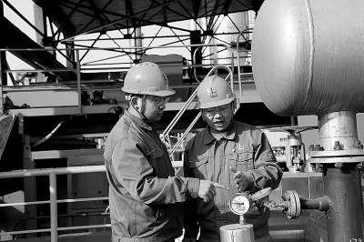 齐鲁石化不断强化基本功训练,将技能培训搬进装置,把学习课堂设在现场,特别是加强新材料、新工艺、新技术“三新”学习。图为2月1日,第二化肥厂气体联合车间技术员王佳俊(右)向徒弟宋奔讲解工艺流程。朱亚菲 摄