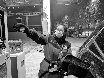 黑龙江石油紧抓销售有利时机,克服寒潮降温影响,全力提升服务、保障供应,1月实现汽油销量同比增幅20%。图为1月31日,哈尔滨石油龙环加油站加油员吕佩航冒雪为客户加注油品。金 鑫 摄 刘 纯 文