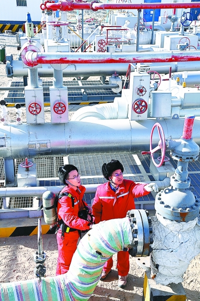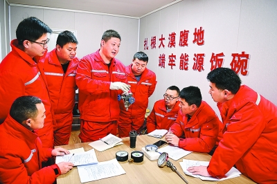 胡庆明 王福全 梁静献 图/文 2月3日,在塔克拉玛干沙漠腹地的“深地一号”顺北油气田,西北油田采油四厂顺北尖刀班班长刘守朝一大早就来到顺北4-2阀组站,查看现场施工的准备情况。 上午,他还要到20余公里以外的高产井4-5H井现场,施工队伍将在那里开展井口更换管线作业。在这里,各项油气生产活动愈加繁忙。 尖刀班是西北油田驻扎位置最偏远的班组,也是中国石化“最富有”的班组。他们管辖的29口油井中,20口油井的初期油气日产当量达到千吨以上。目前,班组管辖区块的原油、天然气日产量分别占顺北油气田日产量的65%、88%。“高产井就像孩子,需要倍加呵护才能健康成长。”刘守朝说,“成立尖刀班,就是为超深油气井持续稳定高产保驾护航。” 顺北油气田地域广阔,井间距离少则几公里,多则数十公里。尖刀班的30余名成员分别驻扎在3个基地,负责3个油气区域油井和管线巡检、故障处置等十余项工作。班组配备了多台无人机,大幅提升了巡视管线的效率。遇到管线裸露、地形明显变化的区域时,他们还是要徒步进行人工巡检。 在营房车搭建的会议室里,10余名新员工正在学习操作技能。他们即将以尖刀班新成员的身份,开始新的事业。在他们背后的墙上,“扎根大漠腹地 端牢能源饭碗”几个大字,格外显眼。