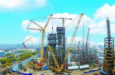 2月14日,中韩石化新建280万吨/年催化裂化装置的再生器封头由五建公司吊装就位。该装置是中韩石化炼油结构调整项目的主体装置,投用后将提升该公司重质原油加工能力,增加化工原料产量。图为2月16日催化裂化装置施工现场。 鲁家宣 摄 何 俊 文