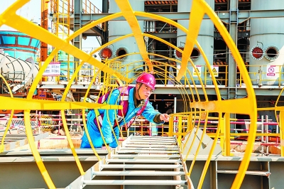 扬子石化高质量推进炼油结构调整项目建设,大力推广模块化施工,主体设备吊装前“穿衣戴帽”,对设备平台等实行地面安装焊接,有效降低高空作业安全风险。图为2月15日施工人员检查塔梯焊接质量。李树鹏 摄