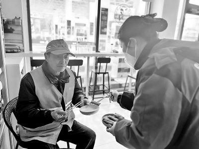 2月21日是农历二月初二,安徽六安石油在爱心驿站开展“龙抬头,吃龙食”活动。站内员工将做好的春卷摆放在店内休息角,邀请户外工作者一起品尝,并为户外工作者送上祝福。图为长安路加能站员工邀请环卫工人品尝节日美食。王 韡 摄