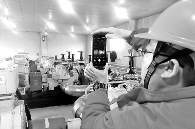 胜利油田海洋采油厂“海油创客工作室”扩展防爆手机、平板等智能终端应用场景,引进“测温热像仪”,直接连接防爆终端,通过App软件,实现便携可移动式测温。图为2月16日,油气集输管理中心海三联合站员工运用新设备进行红外测温。许 亮 摄