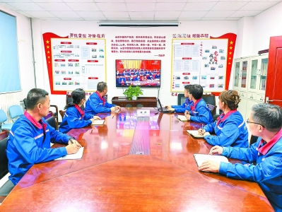 全国两会期间,各单位干部员工通过电视、手机等多种途径积极收听收看,持续关注两会动态。图为3月7日,新疆乌鲁木齐石油油库员工收看会议报道。卢 艳 摄 孙 筱 吴 丹 文