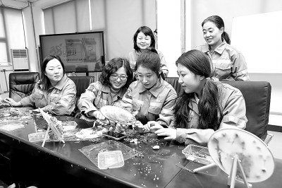 图3:3月3日,天津石化各单位组织趣味运动会、永生花团扇DIY、插花等活动,丰富女职工的文化生活,深受女职工欢迎。图为炼油部油品车间女工制作永生花团扇。张训棣 摄
