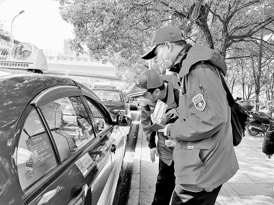 近日,为进一步提升甲醇站点销量,宣传甲醇站点优惠活动,贵州贵阳南明石油制作了甲醇加油站高峰期及优惠情况小卡片,组织员工在贵阳南明区嘉润路和青云路出租车就餐点进行宣传。图为南明石油公司员工向出租车司机发放宣传卡片。黄清琳 摄