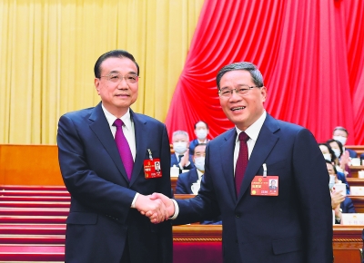 三月十一日,十四届全国人大一次会议在北京人民大会堂举行第四次全体会议,根据国家主席习近平的提名,经过投票表决,决定李强为中华人民共和国国务院总理。这是李强同李克强握手。新华社记者 黄敬文 摄