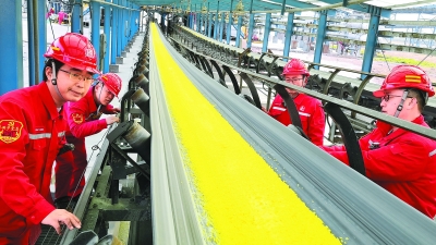 中原油田普光气田是目前国内最大的硫黄生产基地。进入春耕备耕期后,普光气田加大硫黄增产增供力度,全力保障化肥原料供应。图为天然气净化厂储运车间党员突击队查看硫黄传送带运行情况。 汪作庆 摄 白国强 文