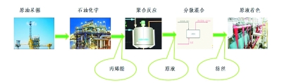 深埋地下的石油开采后进入炼厂,经过常减压装置蒸馏处理,可以从中提取石脑油等组分。接下来,将石脑油送到乙烯装置,在温度700~900摄氏度的乙烯裂解炉中,将其裂解成丙烯。当丙烯与氨、氧气走到一起,在催化剂的推波助澜下,发生了丙烯氨氧化反应,得到了腈纶的原料——丙烯腈。 丙烯腈经过聚合、脱单之后,与溶剂进行混合溶解制得纺丝原液,在此环节加入不同颜色的色浆与纺丝原液充分混合后,有色浆液进入纺丝机。从纺丝机喷丝头出来的浆液,经过牵伸、干燥、定型等工序之后形成纤维,依据后道加工客户的不同需求,同一条纺丝生产线可以生产普通纤维、有色纤维、抗起球纤维等各种各样的腈纶产品,这些各具特性的纤维经过下游纺织服装企业不同的后道加工程序,便制成了人们日常穿着的各类服装和使用的户外用品。
