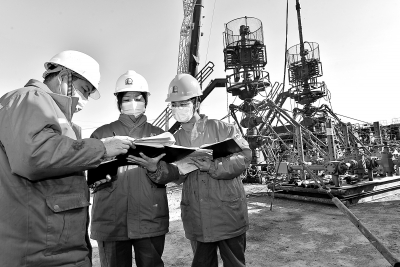 近日,胜利油田河口采油厂在DBDB13-6油井压裂施工中,创新实施桥塞分段压裂工艺、暂堵转向压裂工艺、高速通道压裂工艺等差异化精细分层压裂工艺后,2月份日产油20吨。图为技术人员优化施工方案。 吴木水 摄 刘鑫梅 文
