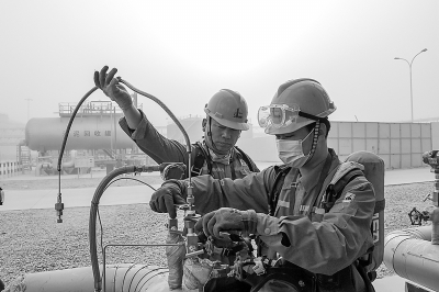 近日,顺北油气田遭遇沙尘天气,最大风力超过8级,能见度只有十几米远。西北油田采油四厂提前做好预案,实时监测现场运行情况,组织党员带头加密厂站设备巡检,开展紧急安全检查,及时排除风险隐患,确保井口和阀组正常,保障生产安全运行。 图一:“深地一号”工程重点探井顺深1斜井在风沙中傲然屹立。图二:趁沙尘暴还没有变大,顺北油气田联合站值班人员抓紧时间取天然气样品。图三:在顺北4-2基地,党员进行例行巡检。李学仁 摄