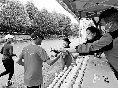3月19日,“千年商港 幸福温州”暨2023年温州马拉松活动开启。浙江温州石油在比赛线路沿途设立“中国石化爱心加能站”服务点,为参赛选手免费提供易捷卓玛泉、一次性雨衣、毛巾等物品,受到运动员们的点赞。图为志愿者为参赛选手递上饮料和食品。夏长啸 摄