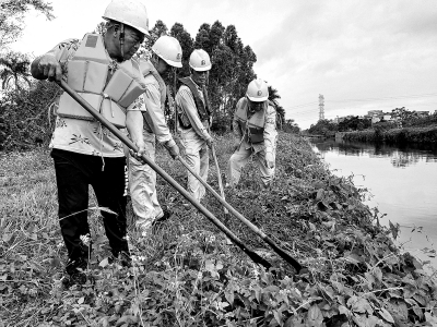 3月24日起,我国进入汛期。茂名石化坚持“早部署、早预防、早研判、早落实”的防汛理念,于3月20日起开展防汛安全隐患专项排查。该公司组成7个小组,采取“专业+党员+村民”方式,对20多公里工业引水渠全线河堤、闸涵、桥梁等水利设施进行全面检查,查找防汛漏洞,确保工业引水渠安全度汛。图为3月26日,员工对河堤进行安全隐患排查。 张木旺 摄