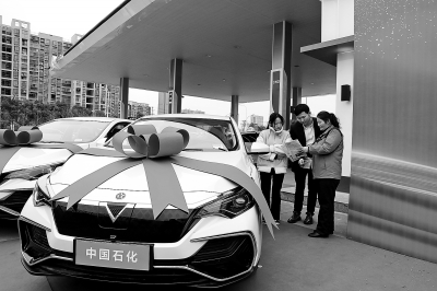 安徽石油利用闲置资源,搭平台、建机制,在加油站打造10个汽车展厅,推出售车+加能+购物+维保+置换一站式服务,一季度销售额同比大幅增长。图为近日合肥石油潜口路综合加能站员工向客户推介新车。 孙德荣 摄