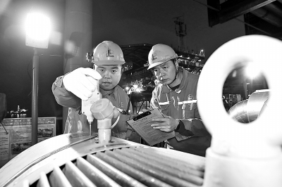 胜利油田海洋采油厂中心三号平台实施员工巡检“表单化”管理,分类梳理出变配电、油、气、水处理等600多项日常巡检要点,借助便携式气体检测仪、测振仪、热成像仪等专业设备进行检测。图为4月4日员工对照表单逐项检查外输泵、注水泵运行状态。张 灿 摄