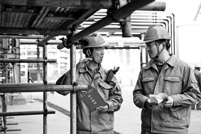 为确保重点检修改造项目的顺利实施,近日,青岛炼化将标准化工地建设作为杜绝现场作业事故的重要抓手,加大项目现场安全管理力度,确保项目检修安全有序推进。图为4月3日安全管理人员对脚手架进行合规检查。 刘 强 摄