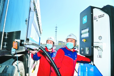 日前,北京石油新建油氢综合加能站——青云店油氢综合加能站投入运营。至此,北京石油从公交加氢车市场拓展到社会加氢车市场,供氢服务覆盖生产经营和城市出行的全部车型。图为4月7日该站员工为货运车辆加注氢气。本报记者 胡庆明 摄 洪晨曦 于 慧 赵兰英 文