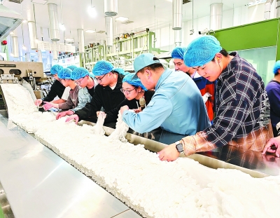 图为合纤一部员工带领前来参观的大学生了解公司刚刚生产出来的涤纶短纤。刘玉福 摄 翟瑞龙 文