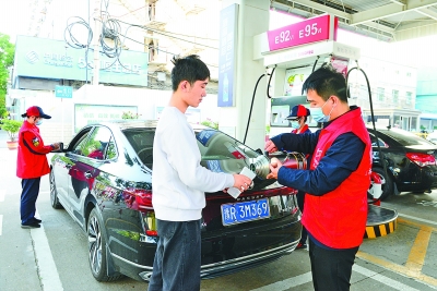 “五一”长假期间,河南石油科学安排配送计划,精心组织油品配送,确保加油站油品供应不脱销、不断档,同时为客户提供加开水、洗车等多种增值服务,为节日期间车友驾车出行提供全方位保障。图为南阳石油青年志愿者为客户提供开水。 姜明武 摄