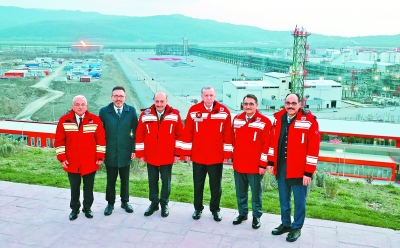 近日,黑海天然气输气仪式在土耳其西北部菲利约斯港举行,这是土耳其首次从黑海气田输送天然气。土耳其总统埃尔多安表示,土耳其正朝着能源独立迈出了历史性的一步,将显著降低对外国天然气的依赖。黑海气田最初开采阶段的天然气日供应量可达1000万立方米,未来有望提升到4000万立方米。数据显示,截至2022年底,土耳其在黑海不同气田发现的天然气总储量已达7100亿立方米。埃尔多安表示,未来一旦满负荷生产,这些储量可满足土耳其30%的天然气需求。图为埃尔多安(右三)出席黑海天然气输送仪式。视觉中国 供图