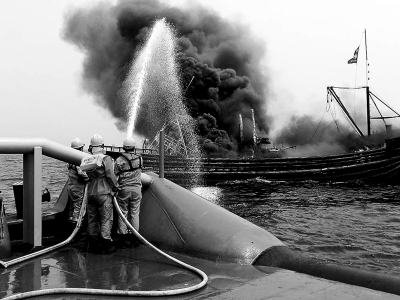 胜利油田海洋石油船舶中心承担胜利埕岛、垦东等海域的应急救援任务,构建起陆、海、空立体联动的应急保障体系,实现油田海上应急全方位、全天候、全覆盖。今年以来累计救助遇险船舶2艘次,救助海上遇险人员12人,实施海上重大抢险作业3次。图为船员在抢救着火渔船。崔舰亭 摄