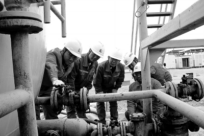 今年以来,西北油田完井测试管理中心建立安全管理长效机制,通过开展施工前联合检查、现场专项检查、视频抽查等方式,抓实完井测试作业安全条件确认及隐患整改,确保安全平稳运行。图为5月14日该中心项目管理人员与承包商人员检查柴油储罐。汤继超 摄