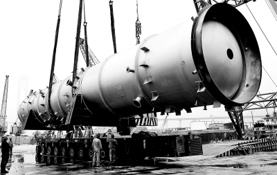 金陵石化积极践行绿色发展理念,加快推进化工一部净化装置技术改造项目。项目建成后,将比原脱酸工艺节能40%。图为5月11日工作人员转运净化合成装置技术改造项目吸收塔现场。张 兴 摄