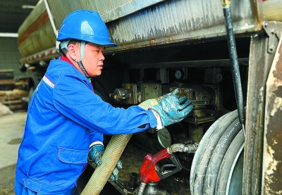 中国石化江西萍乡石油员工正在为中环路重点工程卸油。