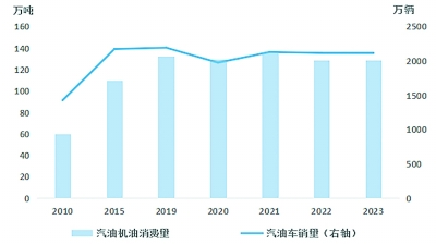汽车销量增速持续下滑带来汽柴机油负增长 汽油车保有量增速持续下滑拖累汽油机油消费量。2022年汽车销量约2686万辆,比上年增长5.3%,其中,汽油车销量1711万辆,比上年下降2%;疫情反复带来的经常性居家办公和旅游出行受限,行驶里程也难以增加,汽油机油消费量出现5.5%的较大幅度下降,消费量129万吨,与2020年基本持平。 柴油机油消费小幅下滑。新能源替代及高速公路限行政策叠加,柴油车销量203万辆,同比下降0.7%,2017~2022年柴油车年均行驶里程下降0.4%,柴油机油消费量下滑5.6%,2022年消费量降至132万吨。 交通用油消费量继续处于缓慢下滑阶段。2022年交通用润滑油342万吨,比上年下降4.3%。交通运输工具的电动化趋势影响汽柴油机具的扩张,加上润滑油品质提升带来换油周期延长,从2018年开始交通运输用油缓慢下行,仅2021年出现消费小幅推高,2022年继续进入平稳下行通道。2022年摩托车用、船用和铁路用润滑油消费量比上年分别下降7.9%、0.8%和2.7%。 国内汽油机油消费量变化情况