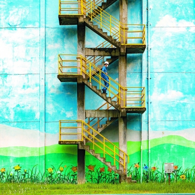 工业也爱小清新。茂名石化化工分部厂区的循环水墙色彩丰富,令人心生愉悦。从楼梯上徐徐走下的员工,像是走入了画里。 柯裕清 摄