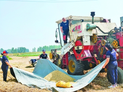 山东日照莒县石油志愿服务队送油到田间,还不忘帮助村民收麦子。朱振军 摄 李玉军 文