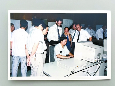1994年7月,南京工程公司前身——南化集团设计院正式签订南京禄口国际机场项目工程设计合同。当时院长带队毛遂自荐,凭借过硬的实力拿下了这个项目。图为设计人员向负责概念设计的美国佳拿公司代表展示工程设计成果。李 舒 供图