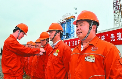 2007年前后,油田企业换成了新样式的橘红色系列工衣。工衣上还特别增加了夜光条,保护夜间作业安全。图为2010年8月,胜利油田黄河钻井五公司(现属胜利石油工程)为星级党员评比挂牌。 赵汝国 摄