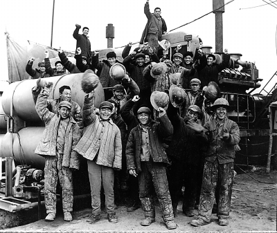 20世纪70年代,在胜利油田参加会战的员工高举头盔欢呼。创业初期,石油工人头戴铝盔、狗皮帽,身穿“杠杠服”、脚踩大头鞋,战风沙、斗严寒,在荒原上高唱《我为祖国献石油》。那浸满泥浆的“杠杠服”,就是最美的勋章。 刘 铁 供图