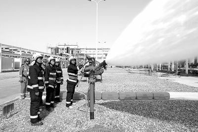 近日,西北油田治安消防中心组织分队、班组进行安全学习,并开展了各类消防安全知识讲座和演练,强化人人知应急、懂应急、会应急,提高全员应急避险能力。图为6月29日,消防人员在厂站测试消防水炮。杨东辉 摄