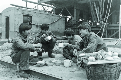 1994年,中原油田生产会战期间,为了节省时间,加快生产进度,钻井工人的午餐都是由炊事员用箩筐挑着送到井场。钻井工人们经常蹲在井场啃馒头、吃烩菜。尽管工作和生活条件艰苦,但中原石油人以乐观的态度,不畏困难、顽强拼搏,在中原油田开发建设和外闯市场中创造出了良好业绩。马洪山 摄