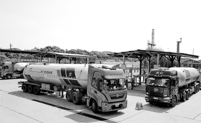 今年以来,巴陵石化强化上下游企业生产、库存信息波动分析研判,把准市场节拍,及时调整策略,全力优化液氨销售业务,上半年外销近8.9万吨。图为7月2日,液氨槽车在合成装置液氨装车站台排队装车。 本报记者 彭 展 摄