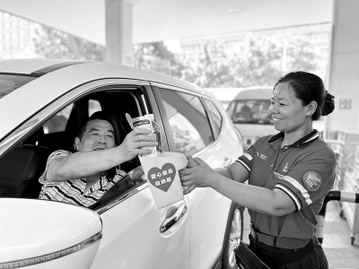 入夏以来,北京石油在440余座加油站开展“我为客户收垃圾”服务,让客户在高温天气不用下车,就能享受贴心服务,受到广泛欢迎。图为十里河加油站员工帮客户清理车内垃圾。张成荣 摄