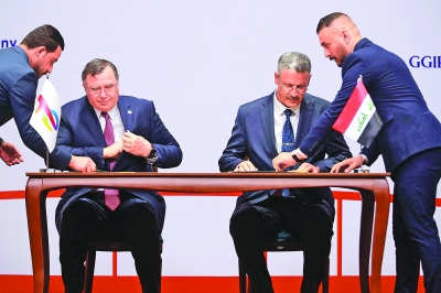 伊拉克政府与道达尔能源近日签署了总额270亿美元的能源开发合同,今后4年内,道达尔能源将在伊拉克建4个大型石油、天然气和可再生能源项目。据路透社报道,双方在2021年就已达成初步协议,但直至今年4月才敲定最终方案。图为伊拉克石油部部长哈扬·阿卜杜勒·加尼(右)和道达尔能源首席执行官潘彦磊在正式仪式上签署天然气增长综合项目协议。视觉中国 供图