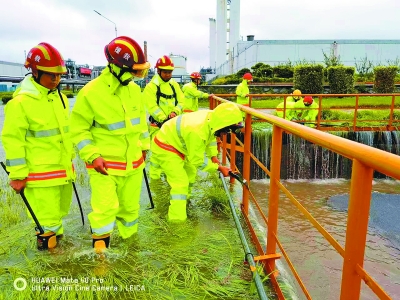 7月28日,福建联合石化消防和公共工程业务团队人员及时清理监控池杂物,降低液位。 林碧聪 摄