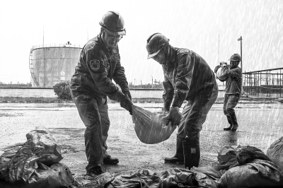 连日来,面对持续高温及强对流天气,中原油田一线油气生产单位积极应对,认真做好极端天气条件下的应急准备,有效健全安全生产风险预警和应急协调联动机制,消除各种潜在风险。图为7月30日,濮城采油厂濮三中转站党员突击队员装填沙袋,封堵进水处,确保注水泵正常运行。赵奕松 摄