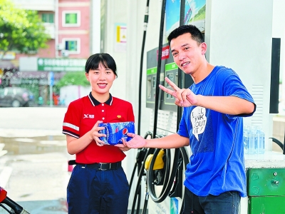 福建漳州石油延北加能站员工向车友推介饮品。许珠绒 摄