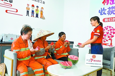 广东茂名石油官渡加能站员工为环卫工人送上免费的冰镇西瓜。李叶霞 摄