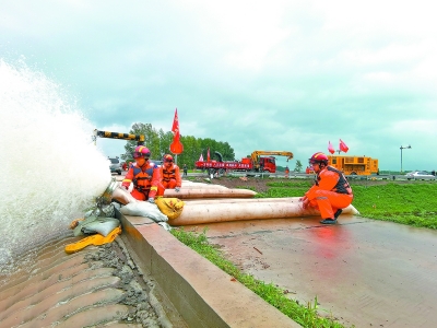 受台风“杜苏芮”影响,吉林省部分地区遭受严重洪涝灾害。8月12日,胜利油田应急救援中心驰援队伍30名人员、11台车辆设备,跨越1300公里到达吉林省扶余市,在拉林河大桥开展排涝工作。截至13日14时,累计排水12万立方米。 图1为救援队员放置抽水泵,准备排水作业。图2为救援队员观察出水口流量。 张立波 摄 范小龙 文