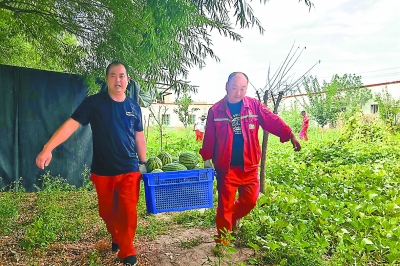 戈壁成绿洲,荒漠变蔬果园。江苏油田矿业开发公司巴州分公司二大队的工作地点位于塔克拉玛干沙漠北缘。该处虽干旱缺水,屋舍却掩映在浓荫之中。 多年来,他们把房前屋后的闲置地块充分利用起来,打造独具特色的蔬果园,还建成了凉亭和林荫道。这既满足了员工的日常所需,又美化了基地环境,提升了员工的幸福感。图为员工在蔬果园采摘西瓜。吴奇杰 摄