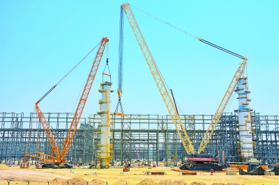 8月16日,五建公司承建的沙特马赞天然气处理项目脱丁烷塔吊装就位,至此,该项目脱烷塔器吊装全部完成。该项目共有10台脱烷塔器,总重量5102.75吨,由五建公司和起运公司共同负责吊装。图为脱丁烷塔吊装就位。吕司鹏 摄 陈 薇 文