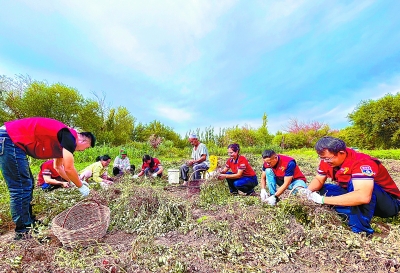 在“访惠聚”工作中,新疆石油组织志愿者服务队开展助农活动,帮助当地缺少劳动力的家庭开展田间劳动、农产品销售和推广等工作,助力农民增收。图为9月19日吐鲁番石油组织党团员志愿者帮助当地村民松土、采摘花生。杨 欢 摄 赵耸炎 文